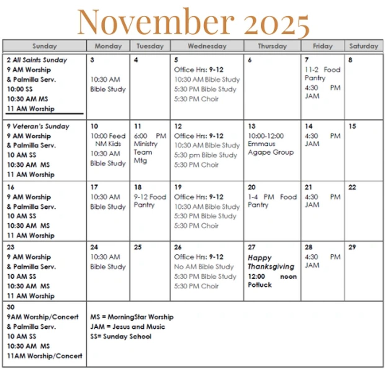 The church bus picks up for the 9 am service. If you need a ride to church, please call the church office. If you are willing to provide a ride for someone to church on Sunday morning, please contact Reuben, Linn or the church office directly at (505) 891-4206.